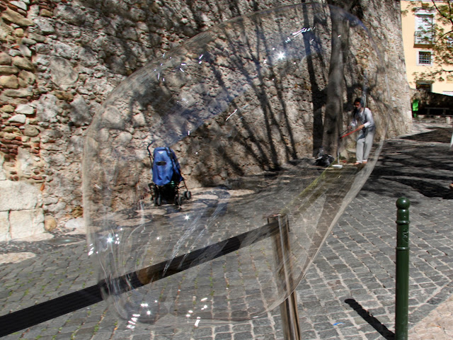 A giant soap bell passes over the street.....